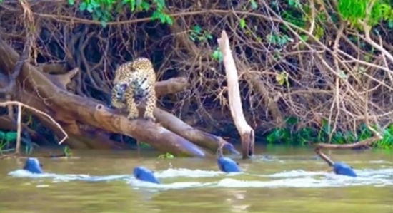 Um grupo de ariranhas não se intimidou nem um pouco diante da aproximação de uma onça-pintada. Tanto que o maior carnívoro da América do Sul deu no pé ao ser encarado pelos membros da "gangue".