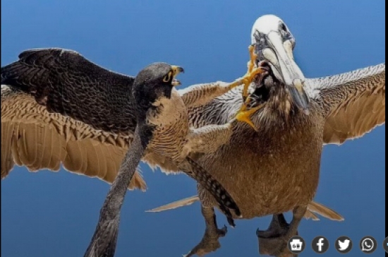 Um falcão-peregrino (Falco peregrinus) mostrou que tamanho não é documento na natureza e aplicou uma surra bem dada em um pelicano imenso que chegou perto demais da área de nidificação