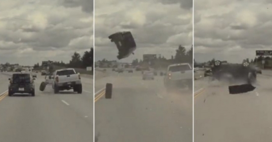 Pneu se solta de caminhonete e atinge carro, que é arremessado a três metros de altura; veja vídeo