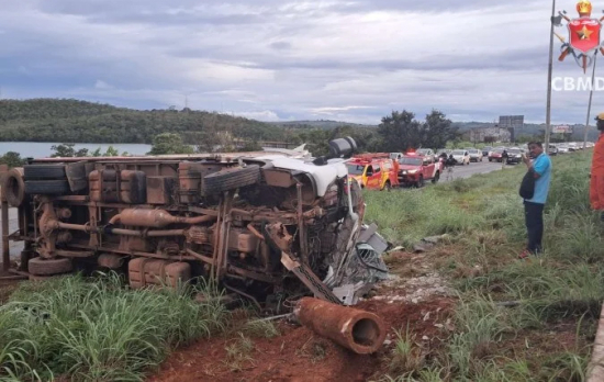 24/02/2026 Caminhão frigorífico colide com poste e tomba na BR-070; motorista fica preso às ferragens